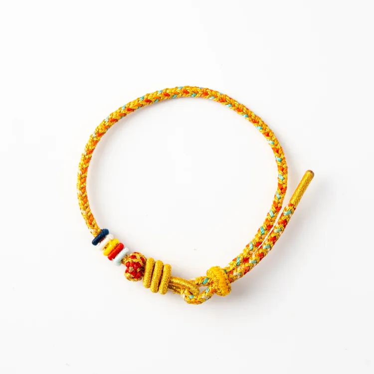 The vibrantly braided silk cords reflect traditional Tibetan knotting techniques, symbolizing the interconnectedness of life and blessings.
