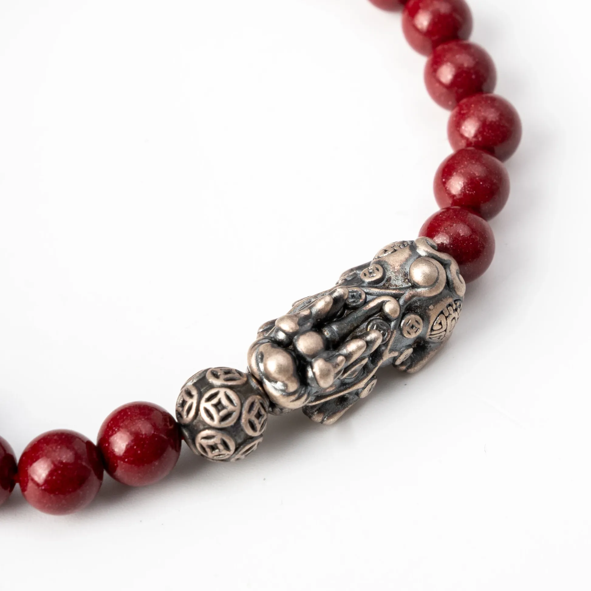 The Crimson Fortune PiXiu Bracelet combines timeless elegance with powerful symbolism, blending the vibrant energy of deep crimson amethyst beads with the protective strength of a finely detailed silver PiXiu charm.