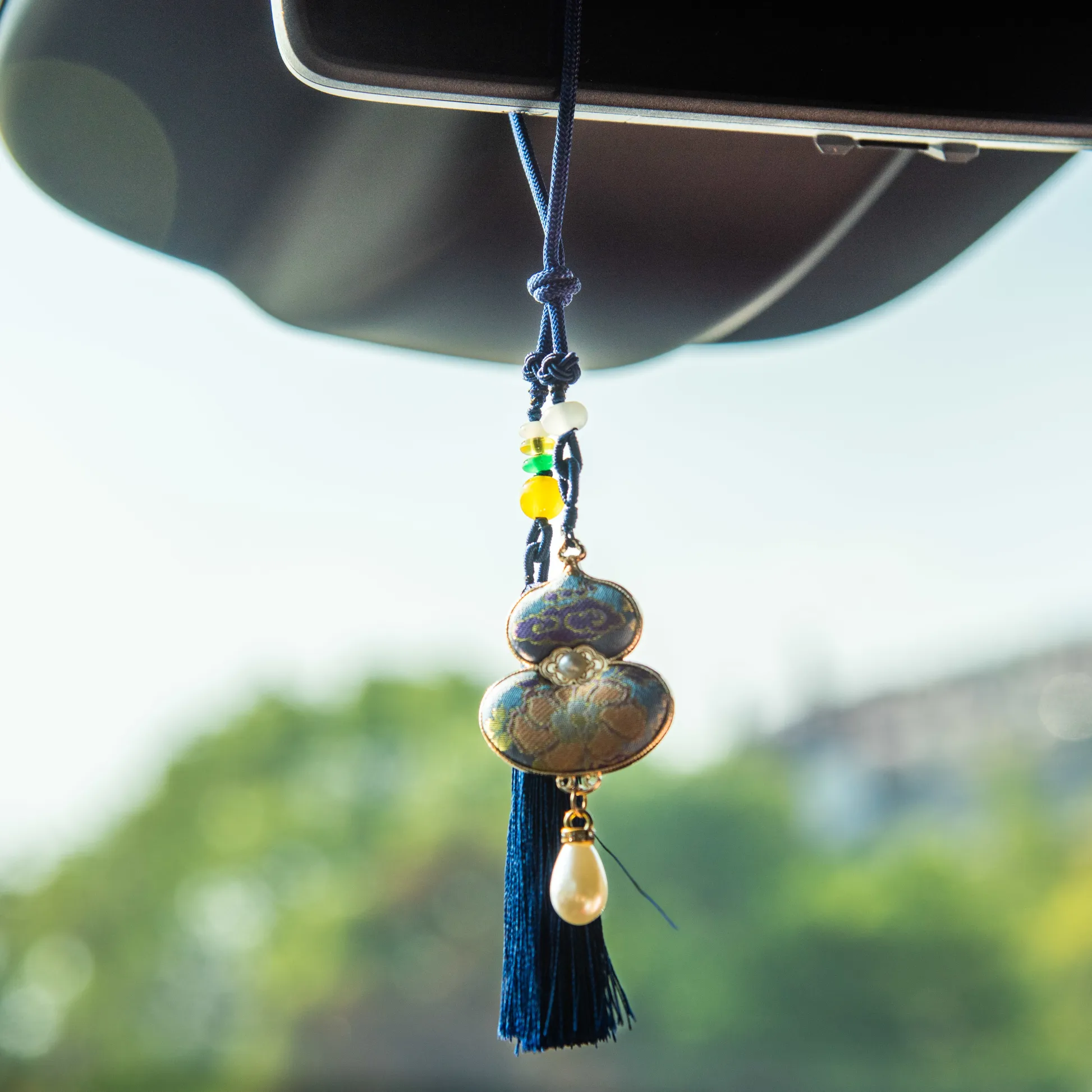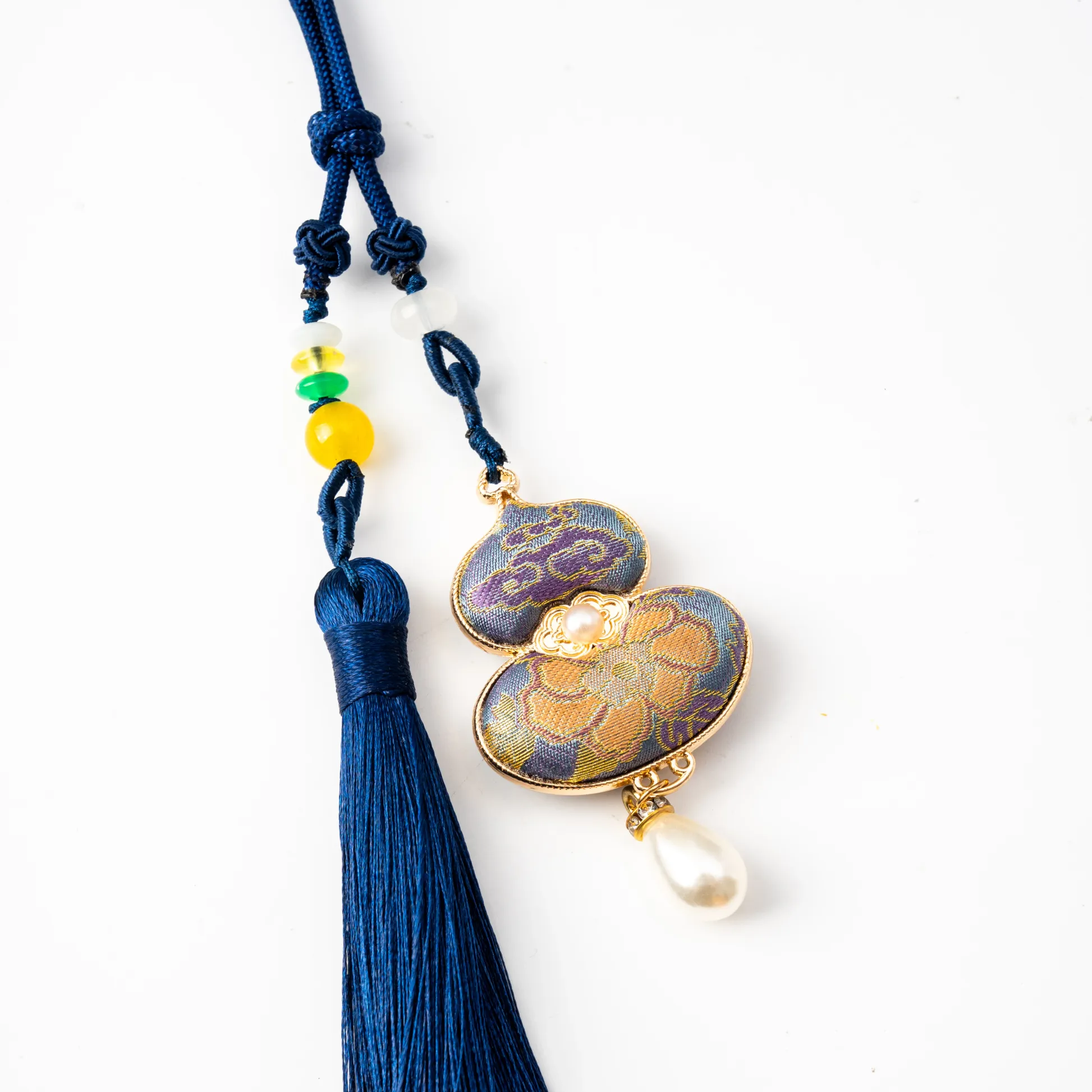 The design features intricate embroidery in rich shades of gold, purple, and blue, inspired by Suzhou embroidery—a UNESCO-recognized cultural heritage craft. The double gourd form, a revered symbol in Chinese tradition, represents prosperity, harmony, and spiritual protection, while the addition of a luminous pearl and flowing tassel brings refined beauty and a calming energy to your environment.
