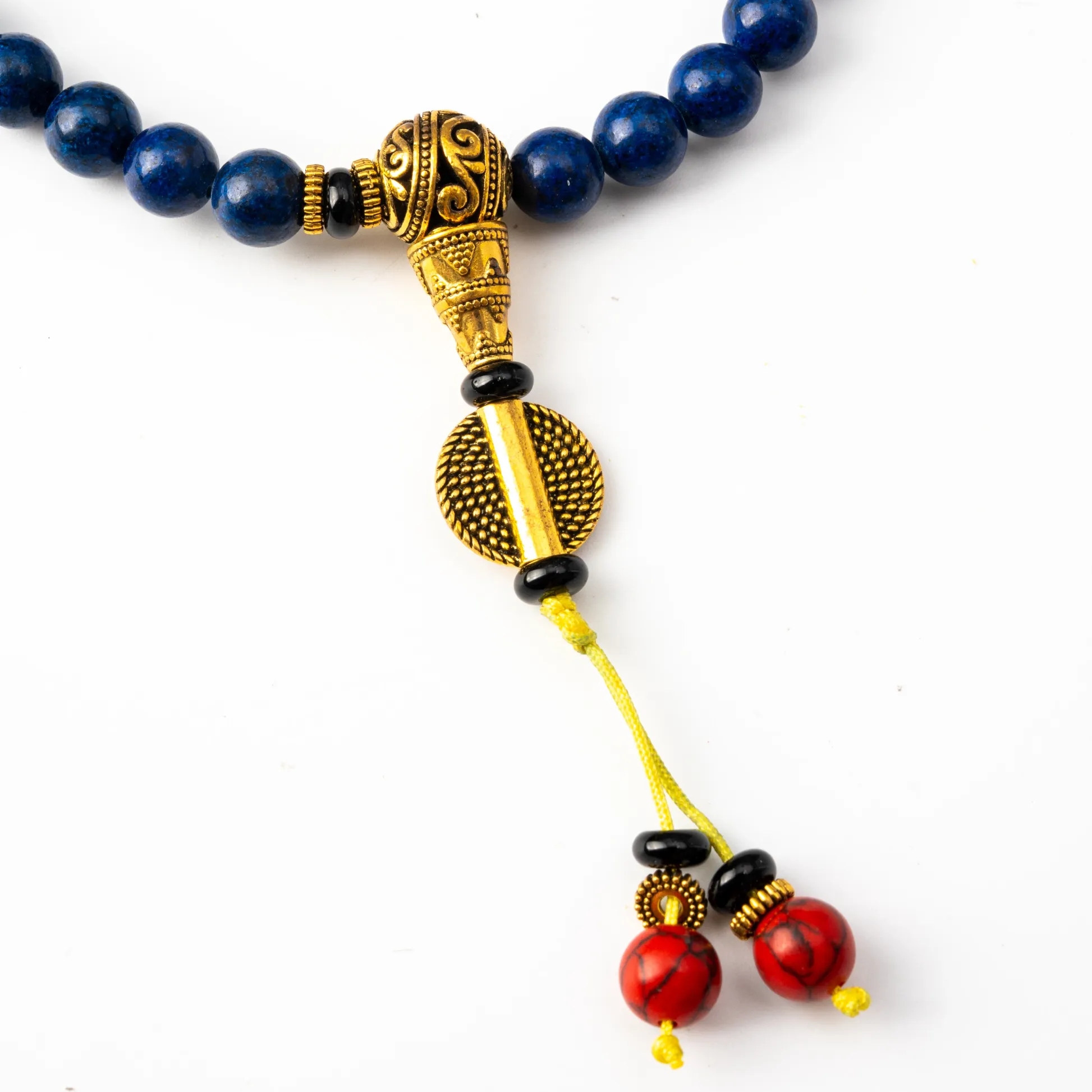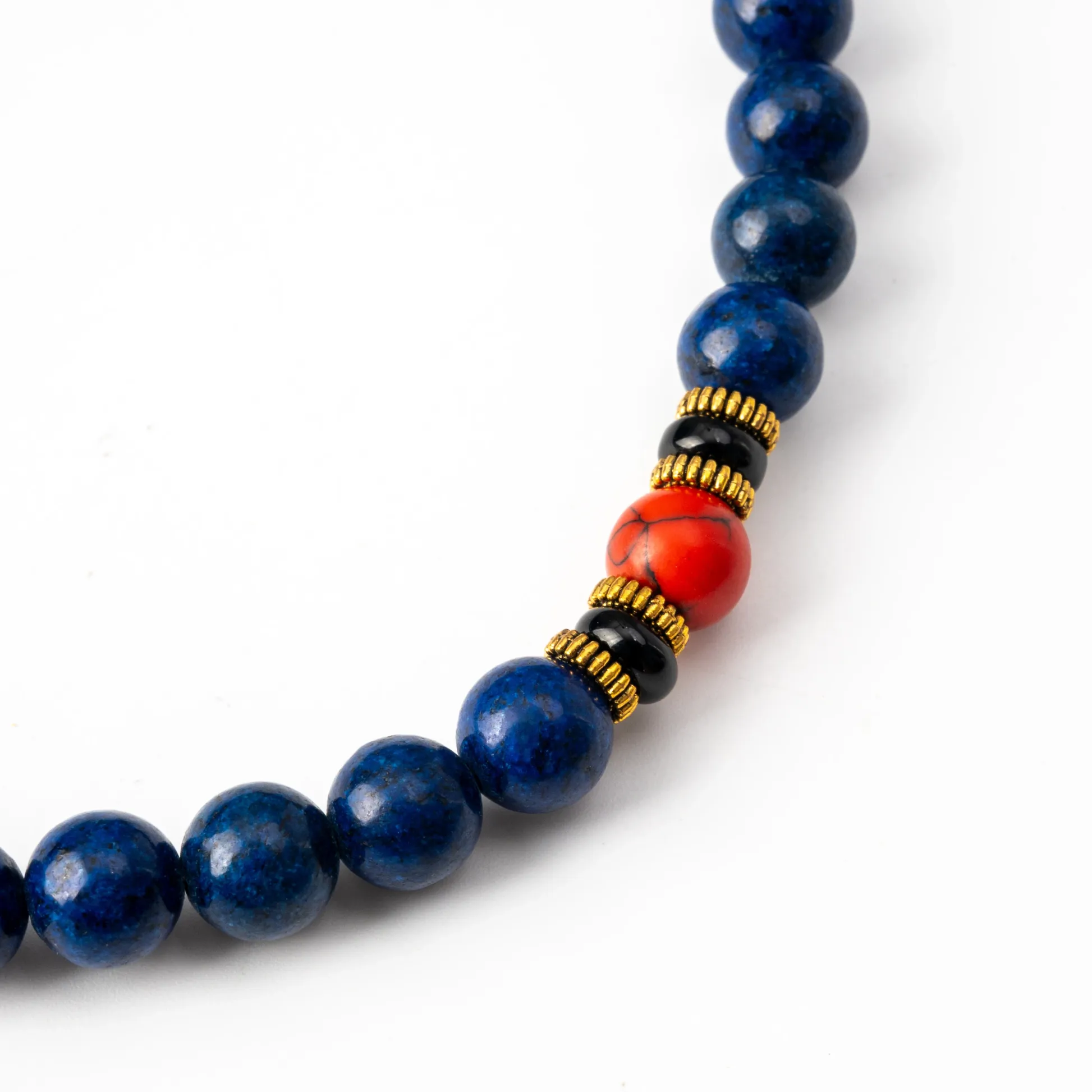 The vibrant crimson beads and tassels symbolize life force, passion, and strength. They act as grounding elements, protecting the wearer from negativity while inspiring courage and confidence. Together with the calming blue of lapis, they create a harmonious balance between serenity and action.