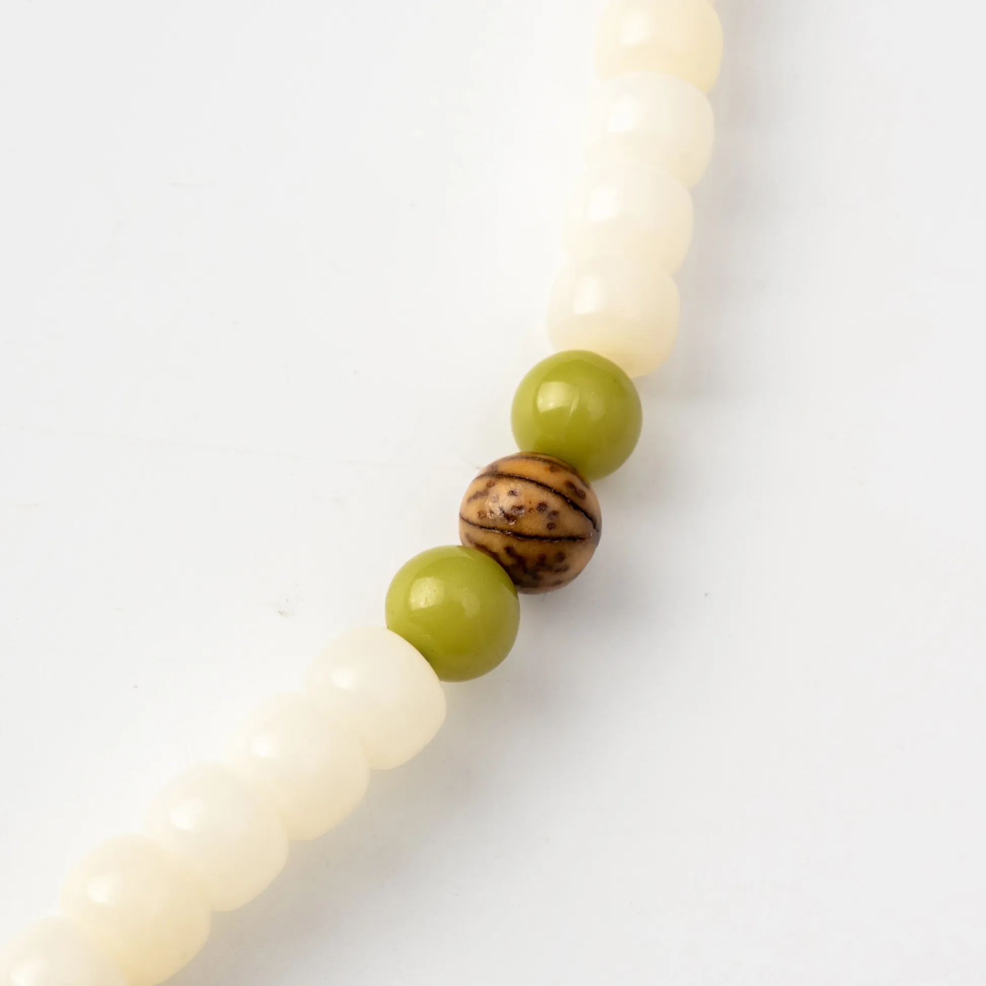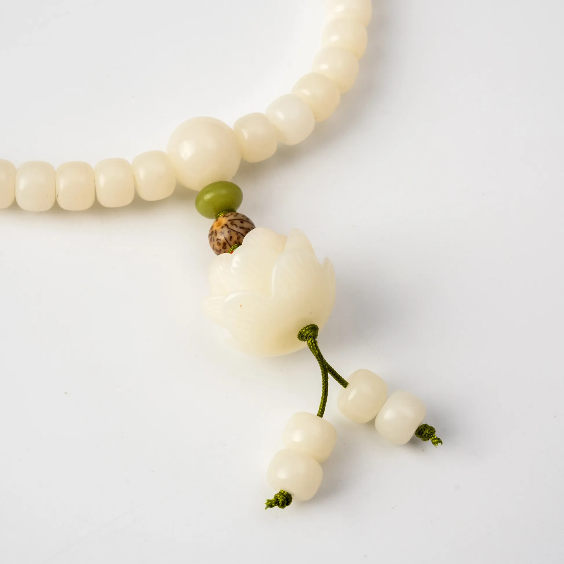White The White Blossom Bodhi Mala is a sacred blend of serenity and awakening, designed to be worn as both a necklace and a wrap bracelet. Featuring smooth, ivory-hued beads with subtle olive-green accents and starry moon bodhi details, it is completed with an intricately carved lotus pendant and descending tassel, symbolizing purity, enlightenment, and inner transformation.
